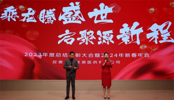四海升平龙献瑞,九州盛世展宏图。2024年2月5日,安徽华源聚源医药有限公司举办2023年度总结表彰大会暨2024年新春年会盛典,本次年会以“乘龙腾盛世、启聚源新程”为主题,公司董事长张宝军与全体员工欢聚一堂。